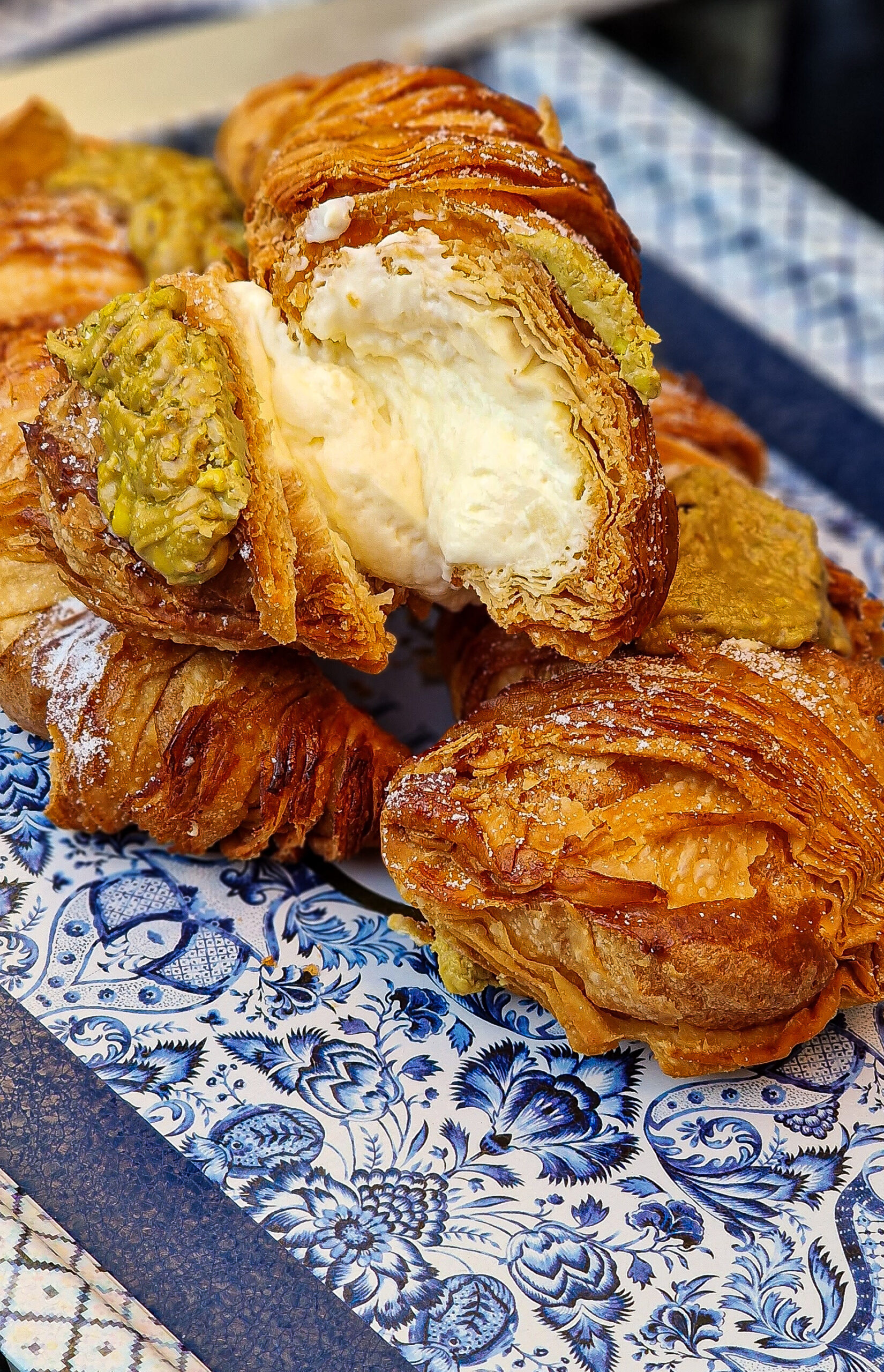 Тоненьке витяжне тісно, випікається до золотистої, хрусткої скоринки, наповнюється  фірмовим пломбірно-вершковим  кремом та фісташковою пастою.